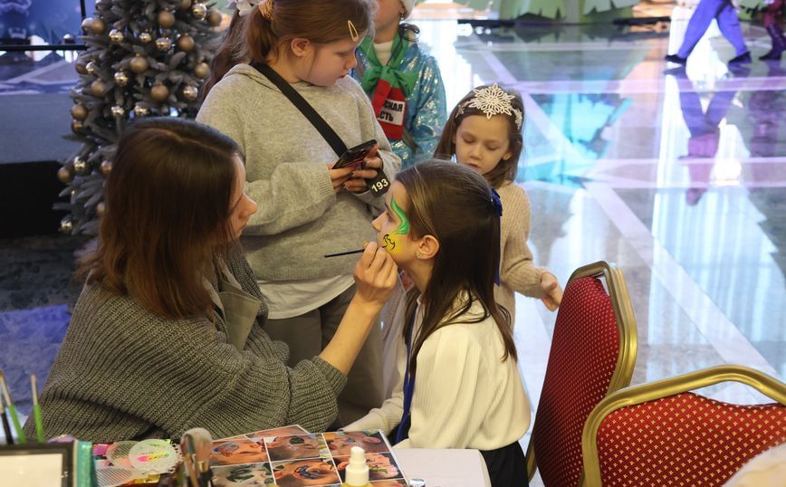 Сказочные персонажи встречали детей прямо на входе в Зал торжественных церемоний. Именно здесь развернулась сцена для представления и площадки для интерактива. Маленьким гостям Дворца Независимости сразу предложили массу активностей и мастер-классов. Ребята могли сделать своими руками сувениры на любой вкус: праздничные открытки, рождественские свечи, елочные игрушки, сказочные маски, волшебные картины и магнитики "Лошадка" с символом 2026 года.