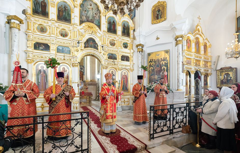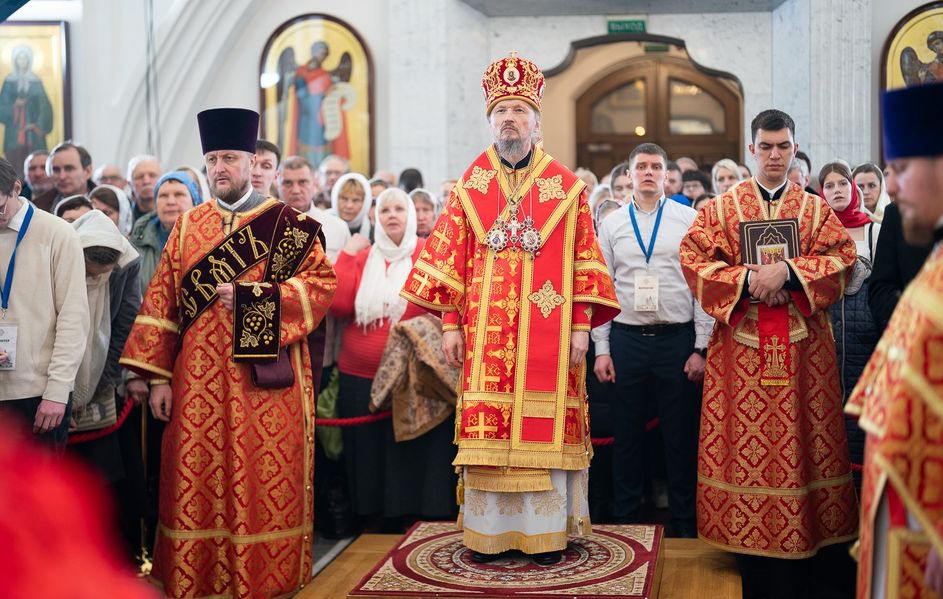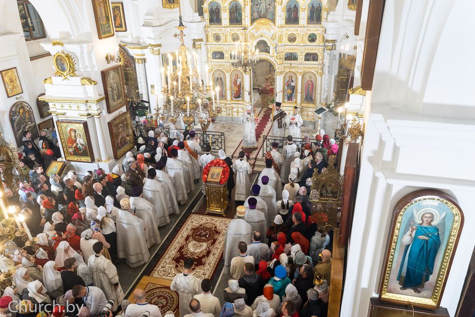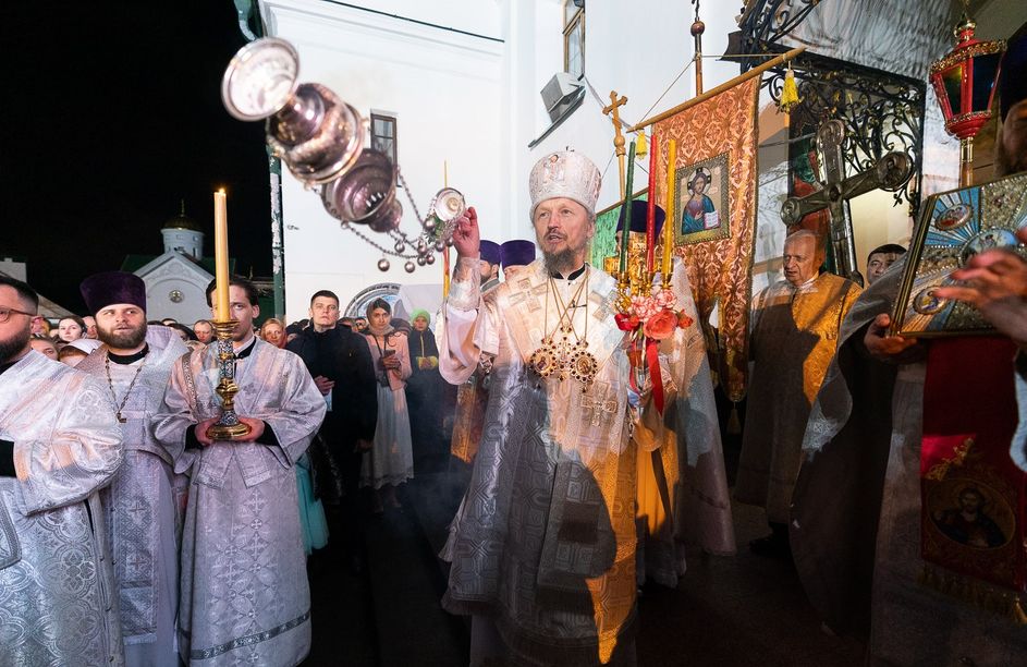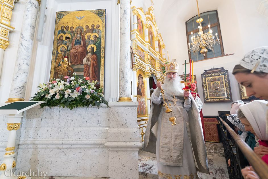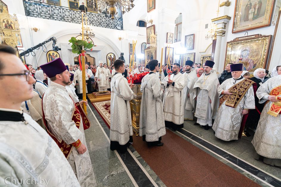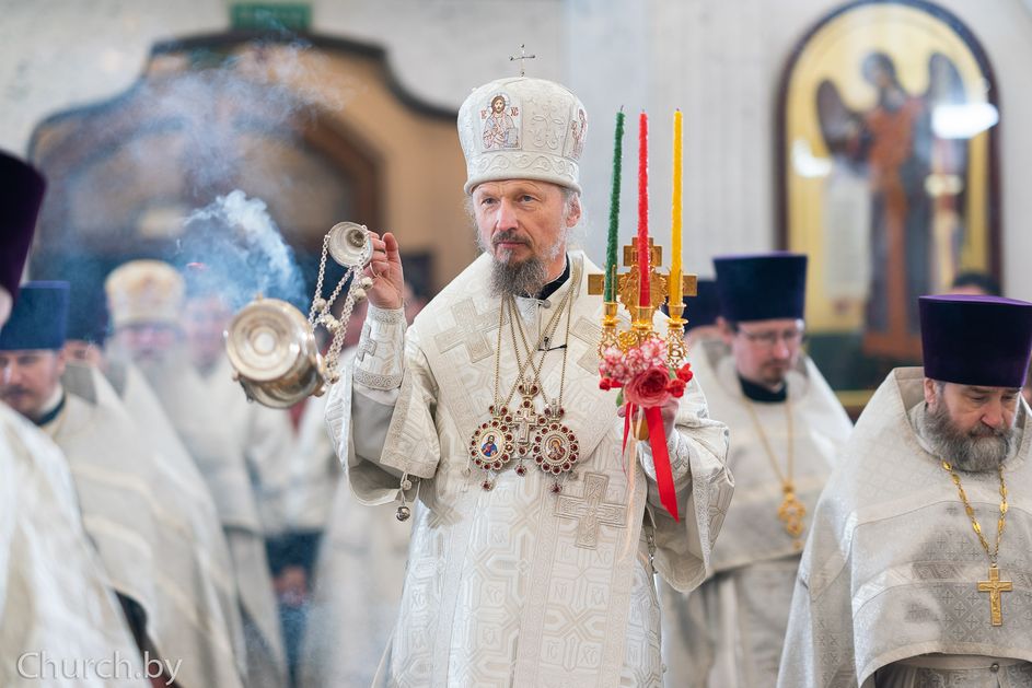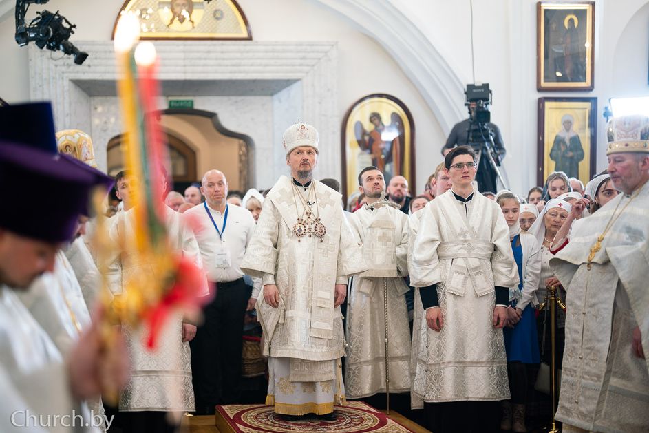 Митрополит Минский и Заславский Вениамин, Патриарший Экзарх всея Беларуси, в сослужении епископа Молодечненского и Столбцовского Павла, епископа Борисовского и Марьиногорского Амвросия и епископа Несвижского Авксентия, викария Патриаршего Экзарха всея Беларуси, совершил Пасхальную вечерню в Свято-Духовом кафедральном соборе города Минска.