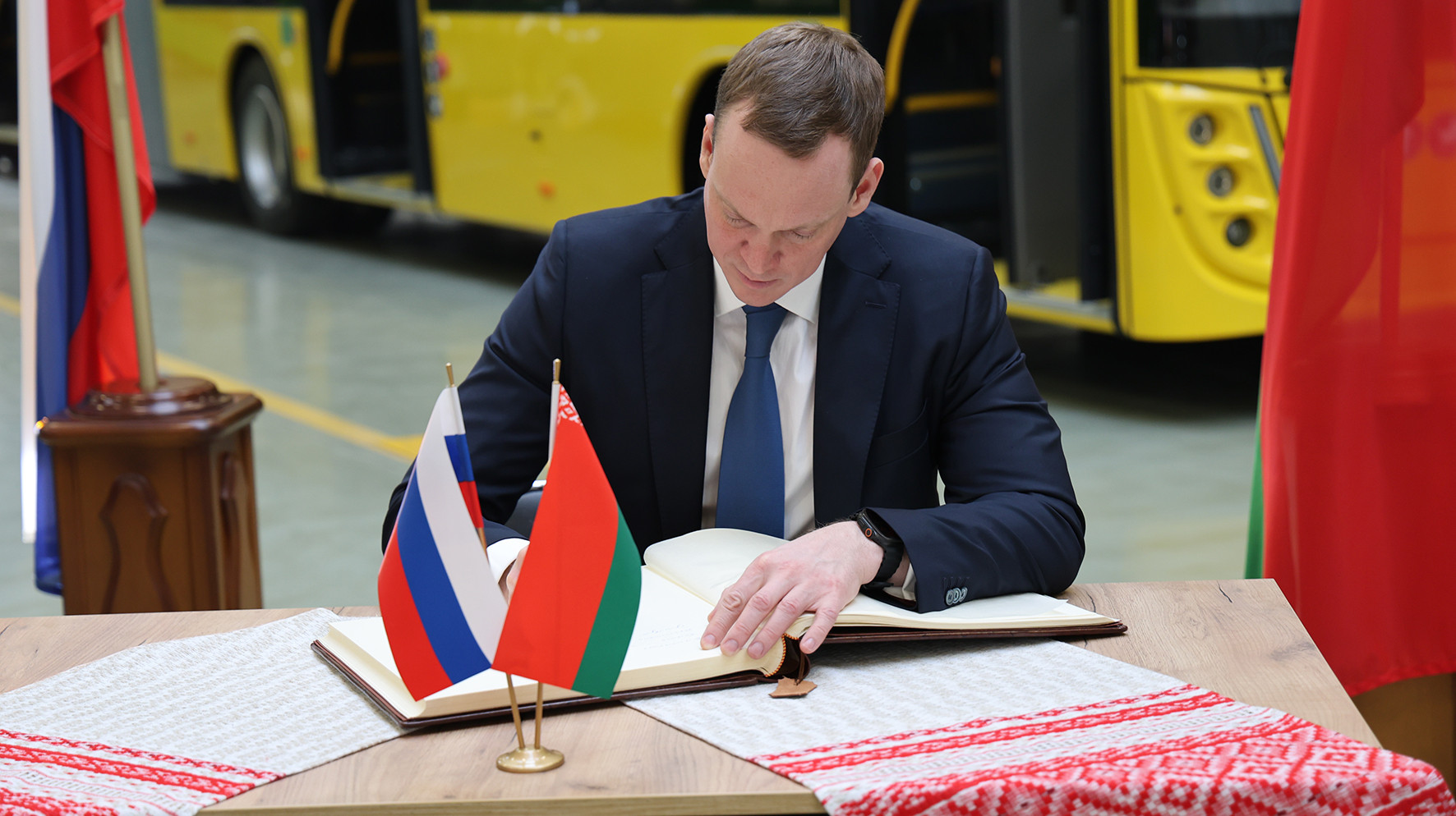 Так, губернатор российского региона Павел Малков ознакомился с новым цехом автобусного завода, а также изучил последние образцы техники МАЗ.