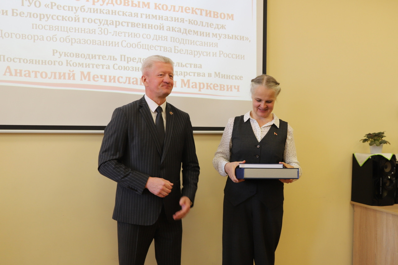 В завершение встречи в дар Республиканской гимназии-колледжа при БГАМ был передан экземпляр нового тома «Библиотеки Союзного государства», выпущенный к 25-летию Договора о создании Союзного государства.