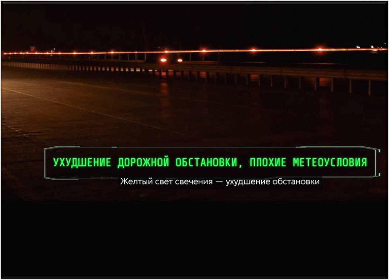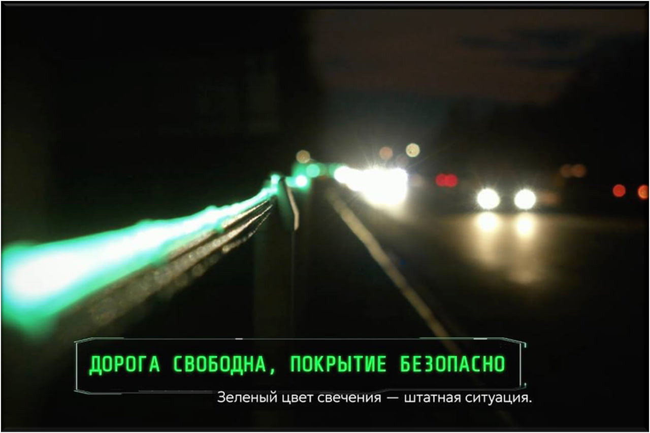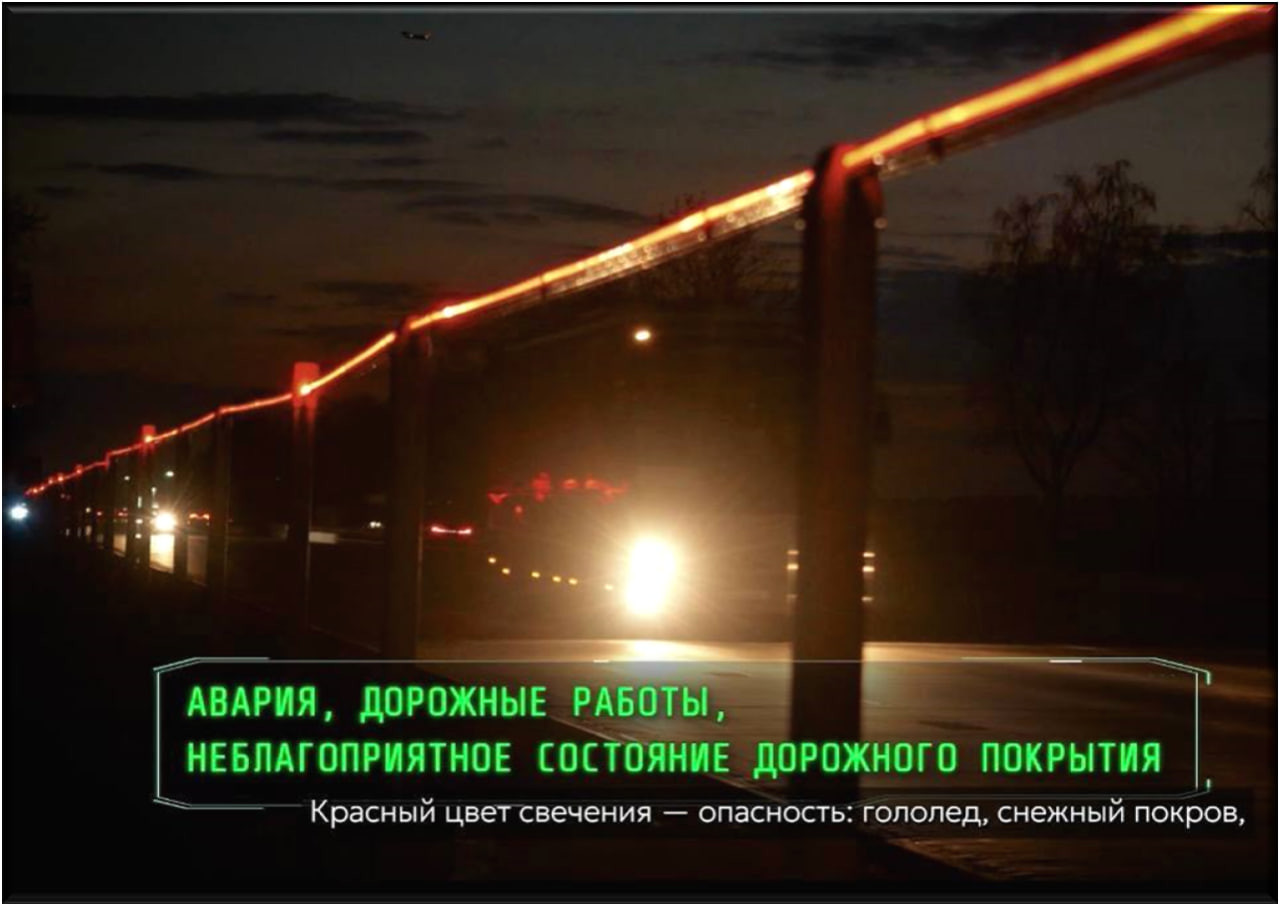 «Также реализована световая индикация вдоль дорожного полотна. Лучше всего она видна в темное время суток», — рассказал начальник ГАИ. Вдоль дорожного ограждения размещено светодиодное освещение, которое с помощью световой индикации сигнализирует водителю о дорожной обстановке: