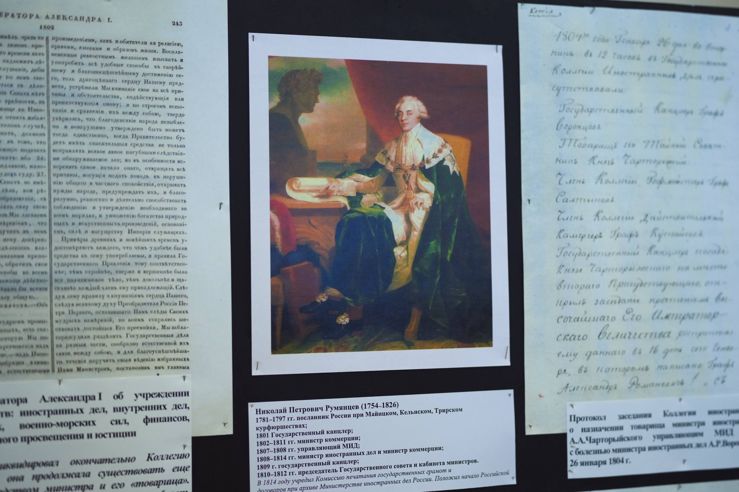 Один из стендов экспозиции посвящён графу Николаю Петровичу Румянцеву, возглавлявшему МИД в 1807-1814 годы. Жизнь и деятельность графа Румянцева — яркая страница общей истории России и Беларуси. Помимо успехов на дипломатической службе, Николай Петрович прославился своим вкладом в благотворительность и просвещение.