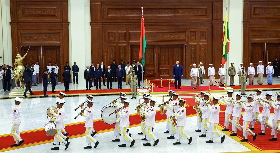 Официальным переговорам Александра Лукашенко и Мин Аун Хлайна предшествовала торжественная встреча с участием роты почетного караула и исполнением гимнов Беларуси и Мьянмы. Затем состоялась церемония совместного фотографирования. Глава белорусского государства также оставил запись в Книге почетных гостей.